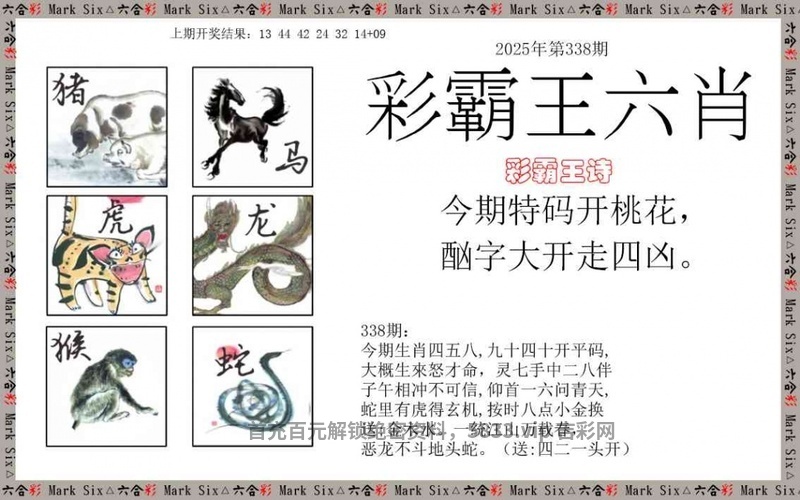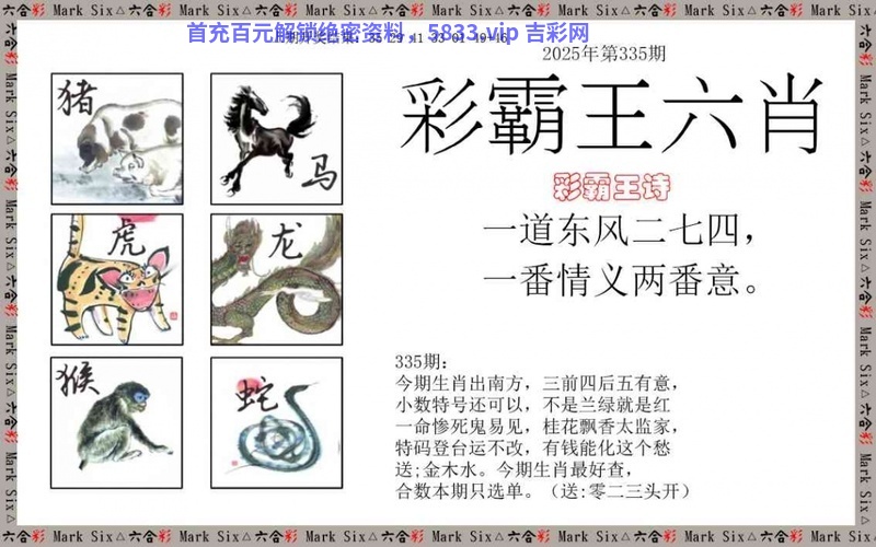 338期:正版彩霸王:今期特码开桃花,酗字大开走四区。 看生肖:今期送凶丑开的生肖 七肖:狗鸡蛇虎龙鼠牛 |